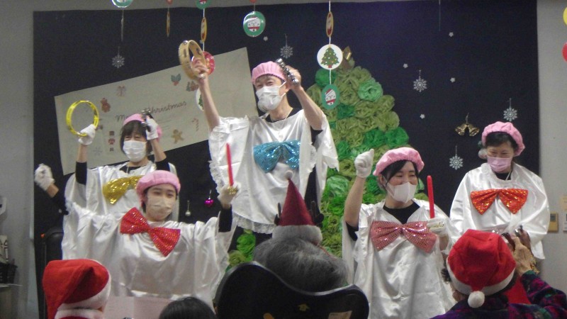 職員による合唱やハンドベルの演奏では、クリスマスにちなんだ曲を披露し、会場は優しいベルの音色に包まれました。