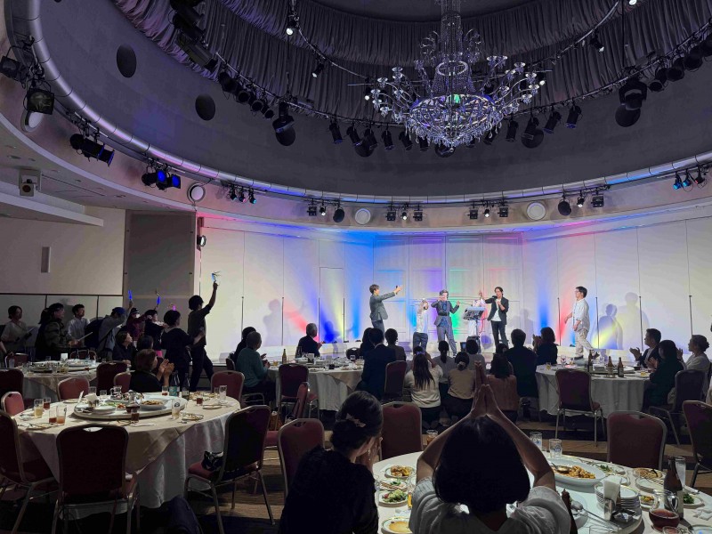 開会にあたり、武政理事長よりご挨拶をいただき、続いて竹村理事による乾杯のご発声で、懇親会が和やかにスタートしました。会の中盤では、「ハートクラブ歌謡祭」と題した余興が行われ、6組の出演者による歌やパフォーマンスが披露されました。トップバッターとして登場したのは今宮施設長。ユーモアを交えたパフォーマンスで、とても良い雰囲気の中、余興がスタートしました。応援隊も大活躍で、ペンライトを振ったり、手作りの応援うちわを掲げたりと、ステージをしっかり盛り上げてくれて、楽しいひとときとなりました。