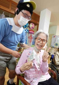 まずはデイサービスで最高齢のご利用者へお祝いの言葉と記念品の贈呈からスタート。