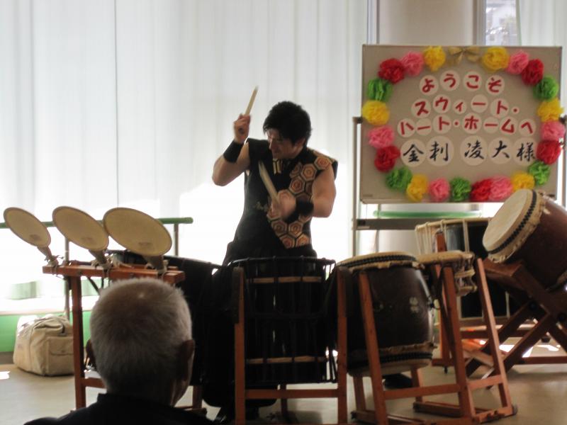 3月14日(木)に、当施設に和太鼓のプロの演奏者「金刺凌大(かねざしりょうた)」さんが来てくれ、演奏会を開いてくれました。(*^_^*)