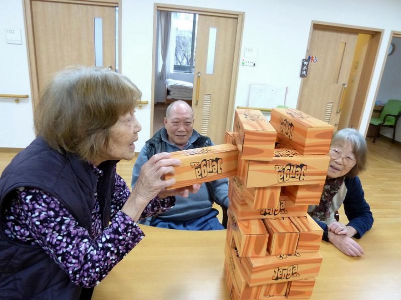 パーツが重ねれば重なるほど「グラグラ」とタワーが揺れ、ご利用者のみなさんは、塔が自分の方に倒れないように必死 ( ´∀` )笑