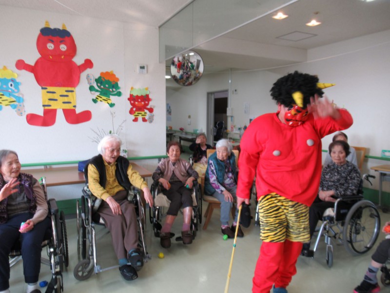 思った以上のご利用者さんの豆まきの気迫に鬼役の職員びっくり!!